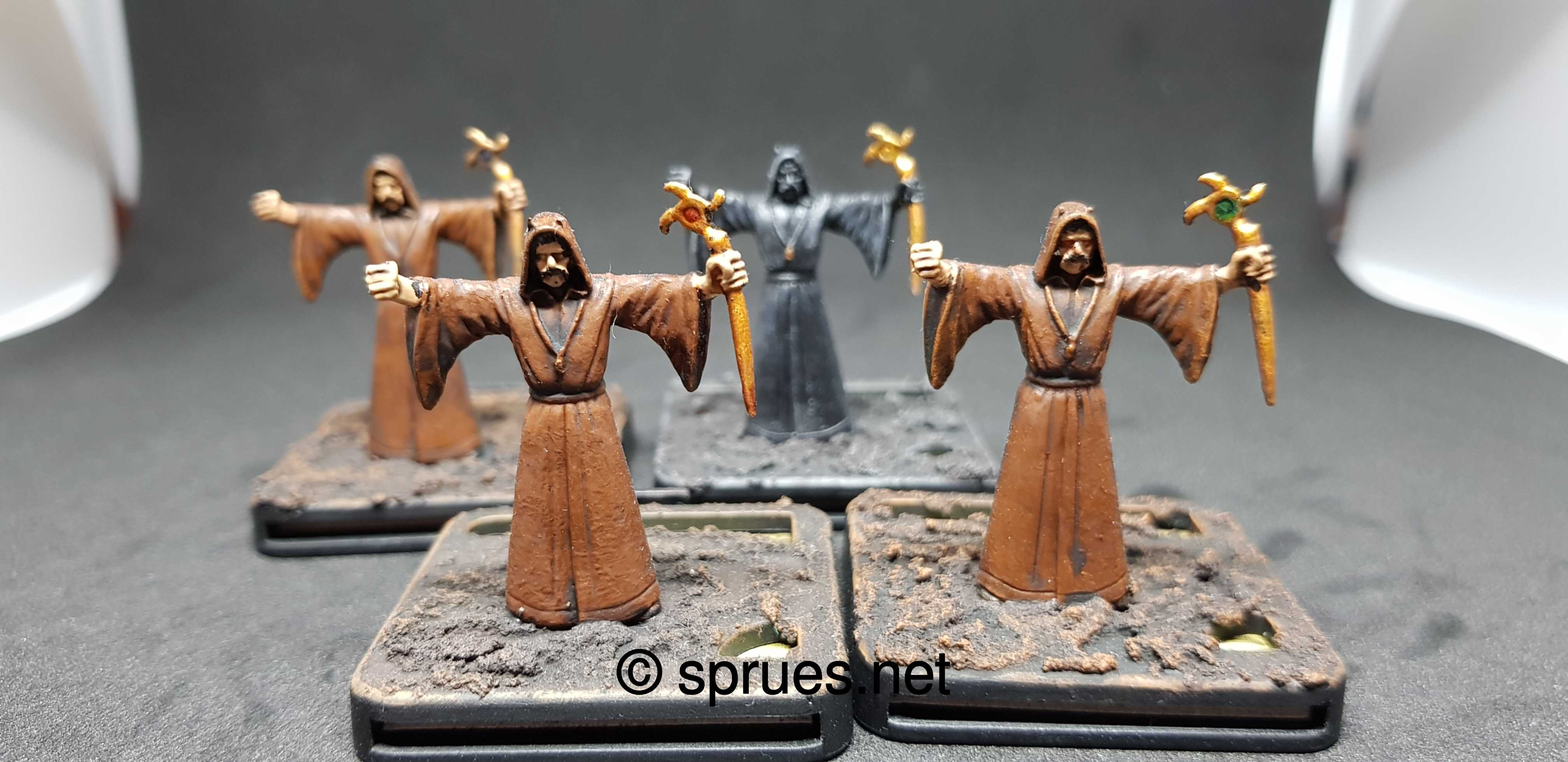 Models from Games Workshop contains often a lot of details. This is in fact really awesome, but it take times to paint them. A lot of time and often these painting process is more complex. So I decided to paint less detailed models, with just basic and fast technics. For this purpose the game Mansions of Madness is perfect. For beginning the Cultists models where chosen. Brown base paint, complete shading and dry brush at the end. Same goes for the basing.