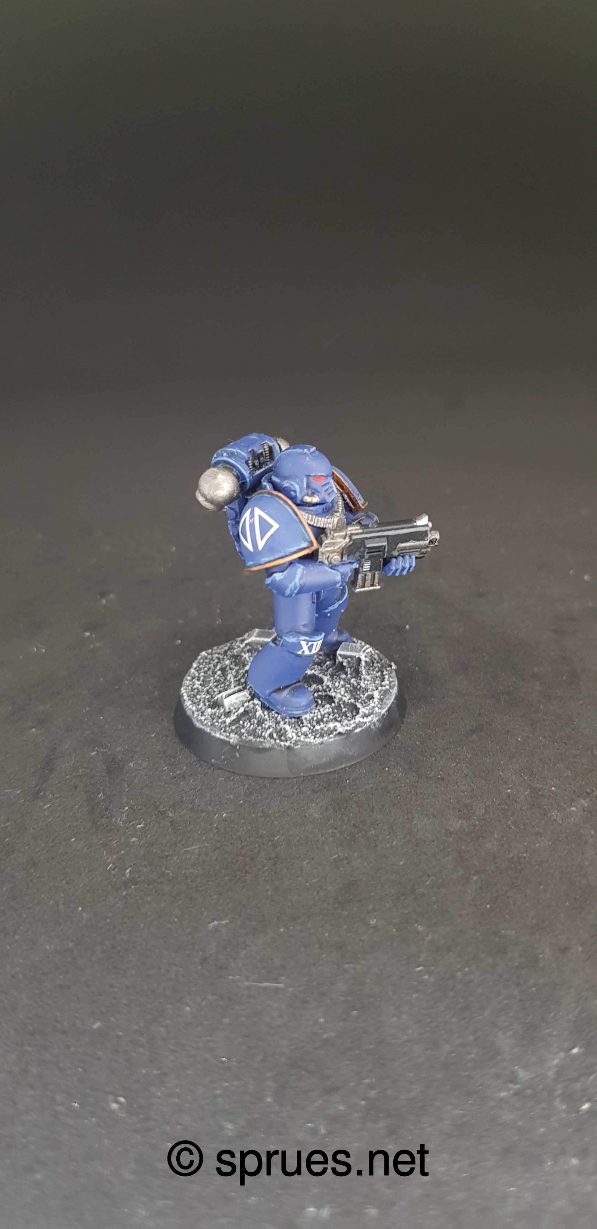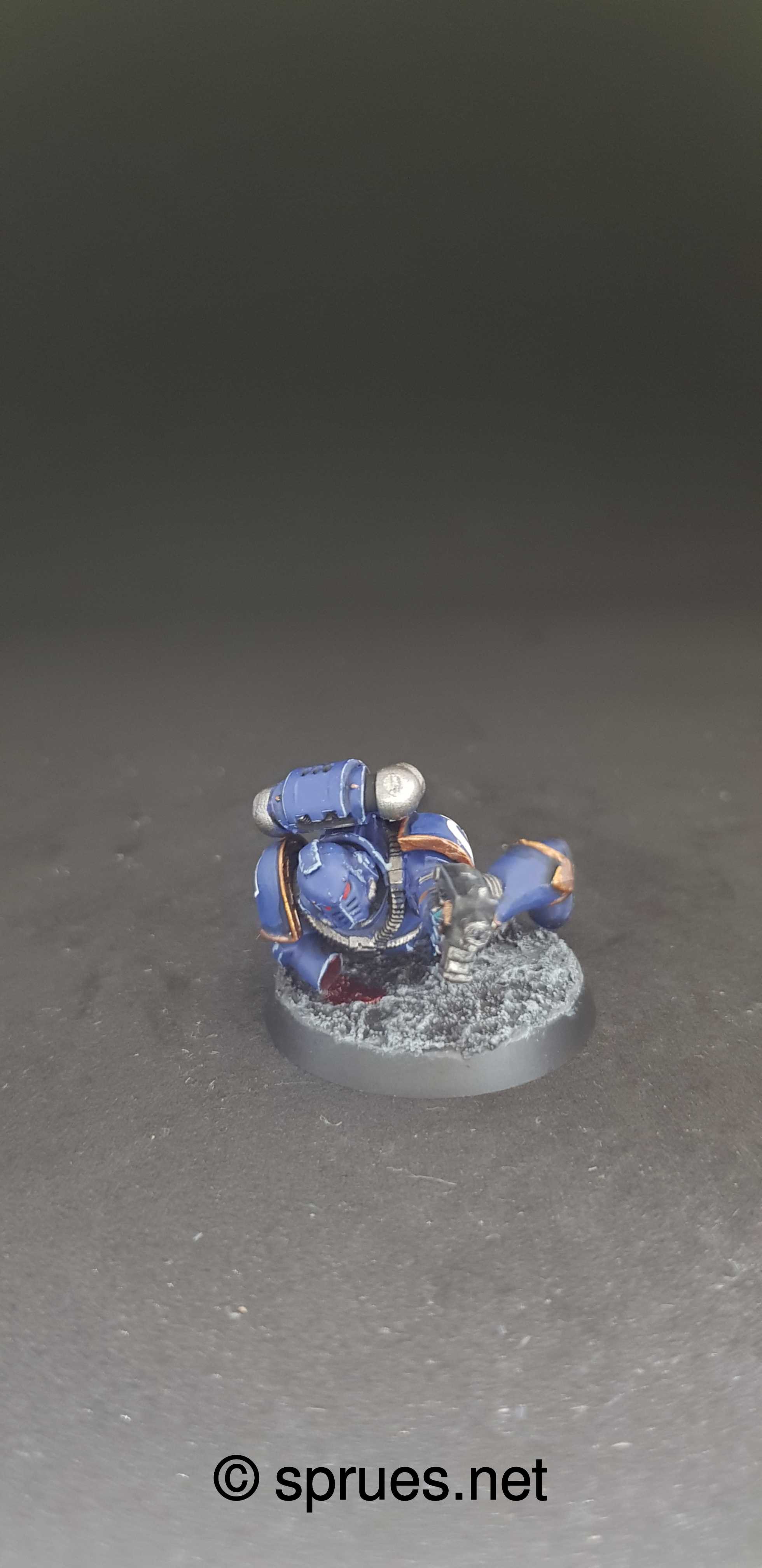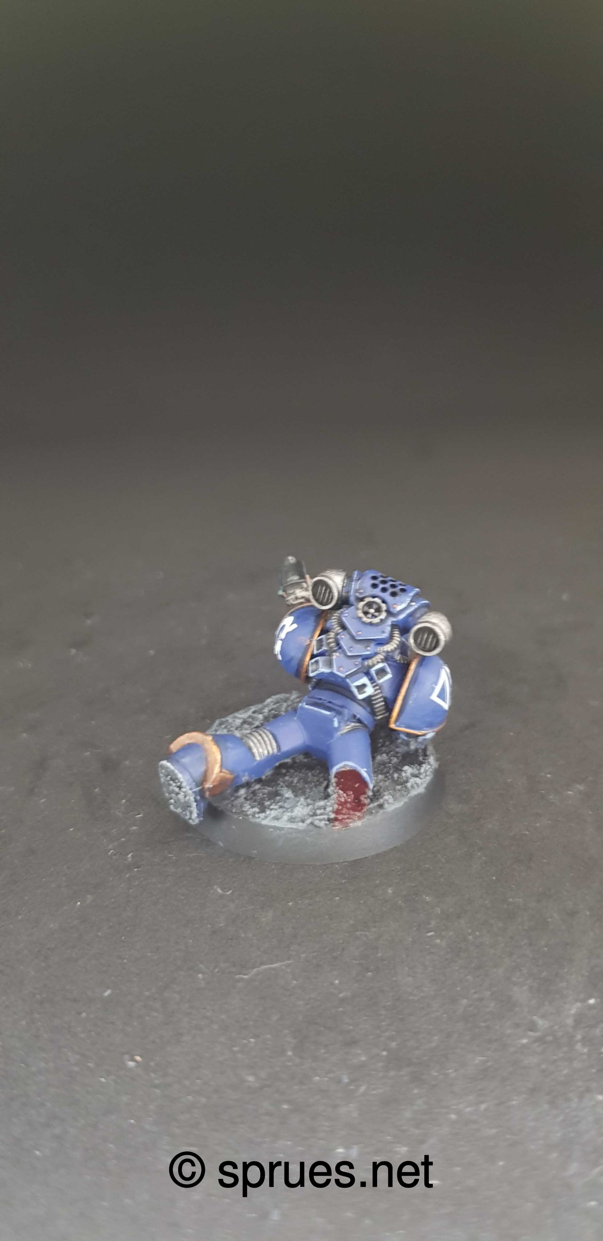 Captain Aethon's Legion Veteran Tatical Squad Ny were fuse together during the Betral at Calth. Take a look at the different models. Referring to the amazing healing ability from Ultramarines one of them is still fighting, even with only one hand and one leg remaining. Also you will notice the red helmet marine with two swords. During The Horus Heresy these red helmets were used to mark a marine for punishment. This red helmet marine represents Sergeant Aeonid Thiel, a famous warrior during the Horus Heresy. All bits for this model were chosen related to the cover art from Neil Roberts for the Short Story Censure.