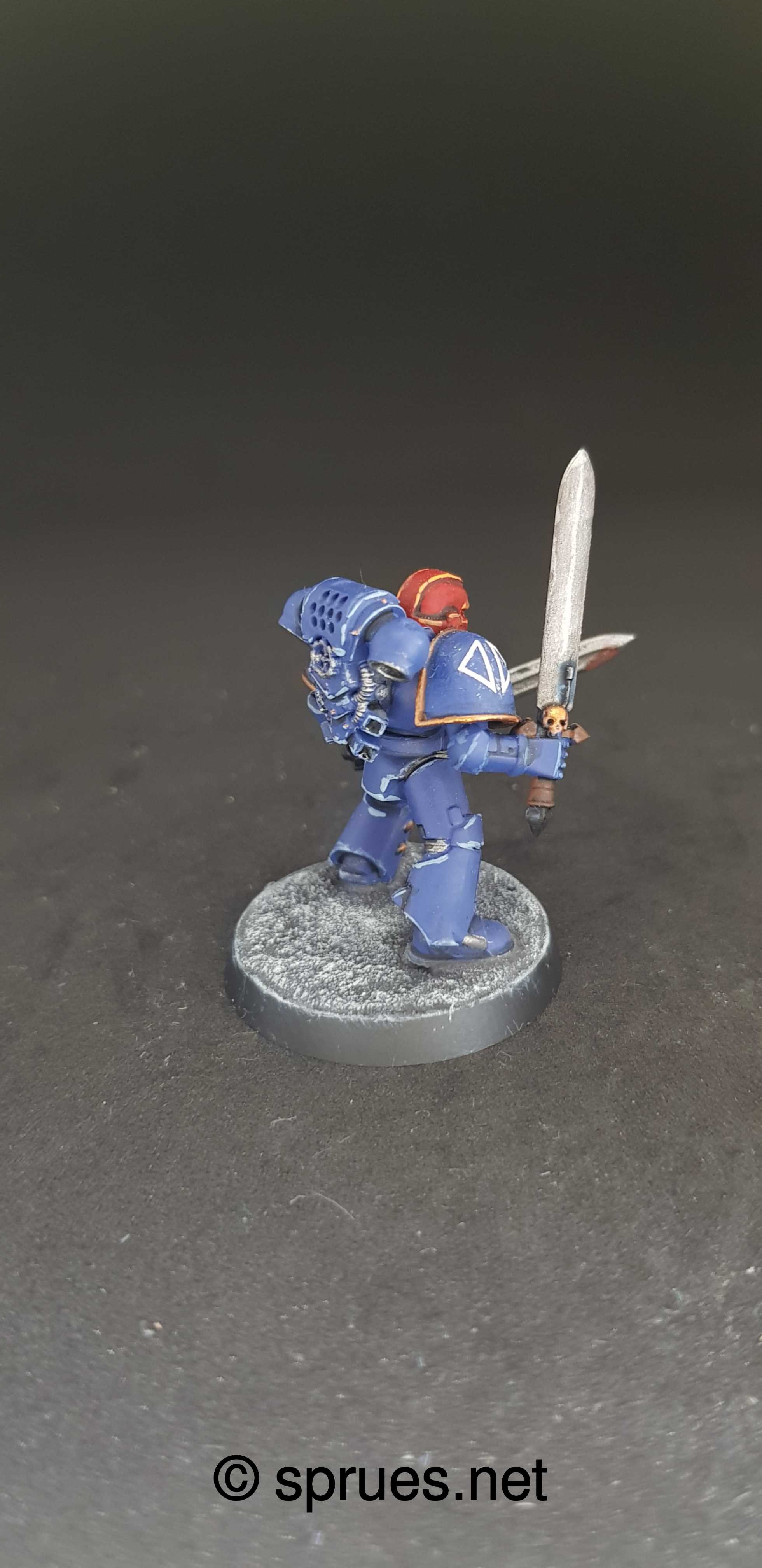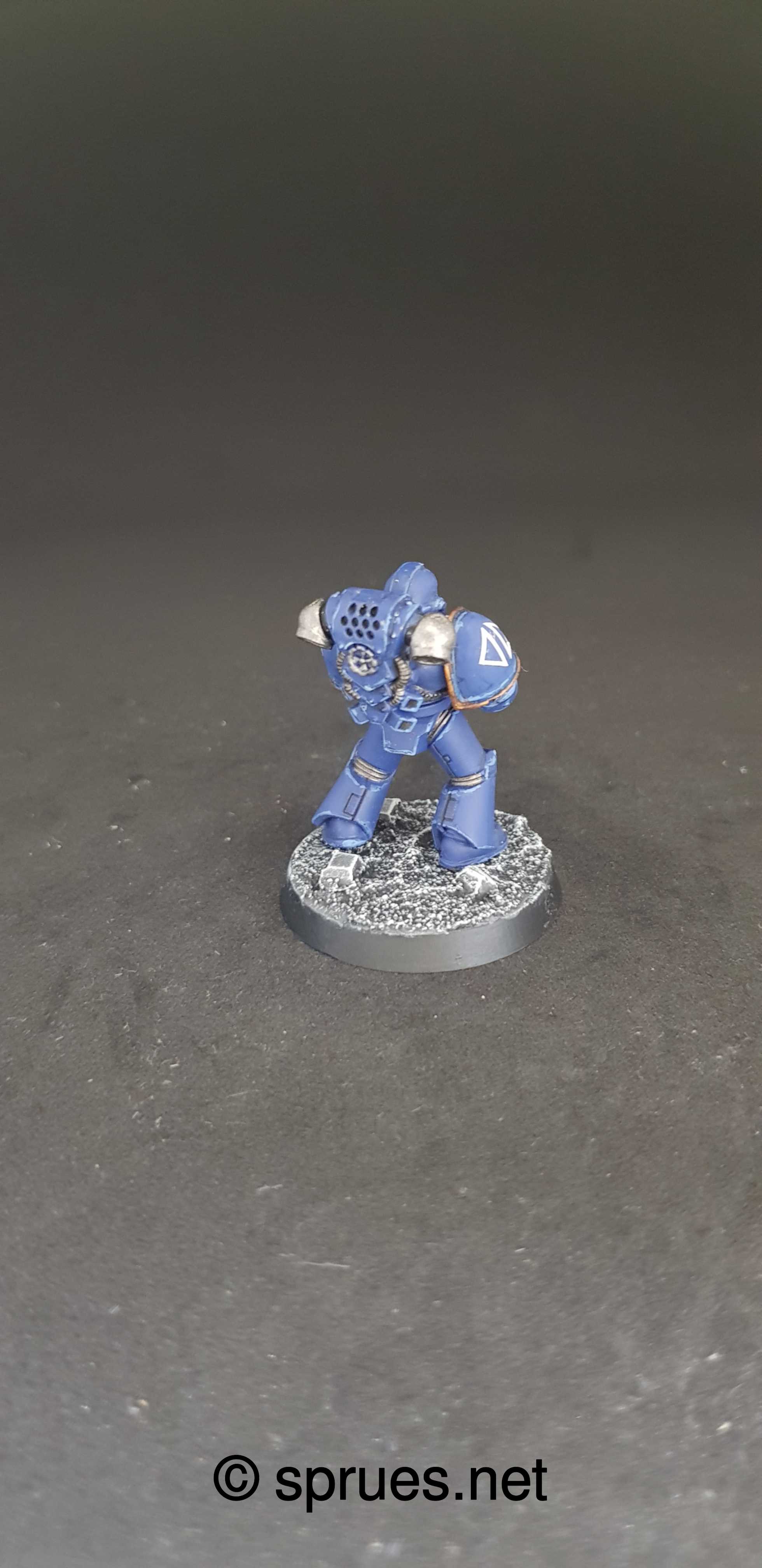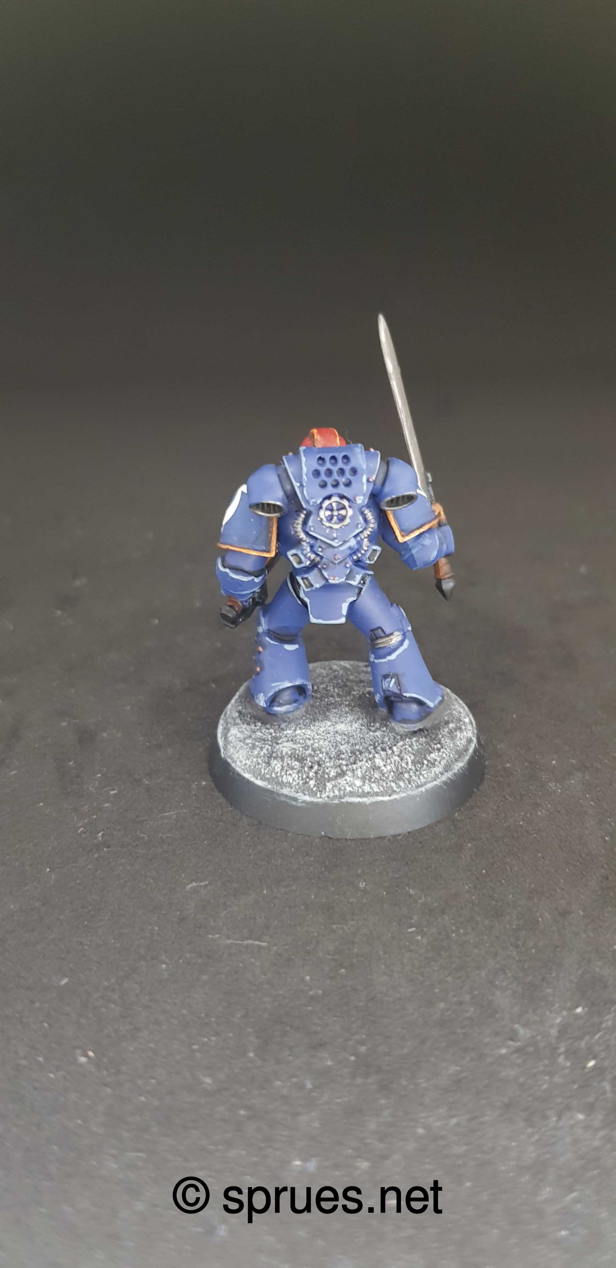 Captain Aethon's Legion Veteran Tatical Squad Ny were fuse together during the Betral at Calth. Take a look at the different models. Referring to the amazing healing ability from Ultramarines one of them is still fighting, even with only one hand and one leg remaining. Also you will notice the red helmet marine with two swords. During The Horus Heresy these red helmets were used to mark a marine for punishment. This red helmet marine represents Sergeant Aeonid Thiel, a famous warrior during the Horus Heresy. All bits for this model were chosen related to the cover art from Neil Roberts for the Short Story Censure.