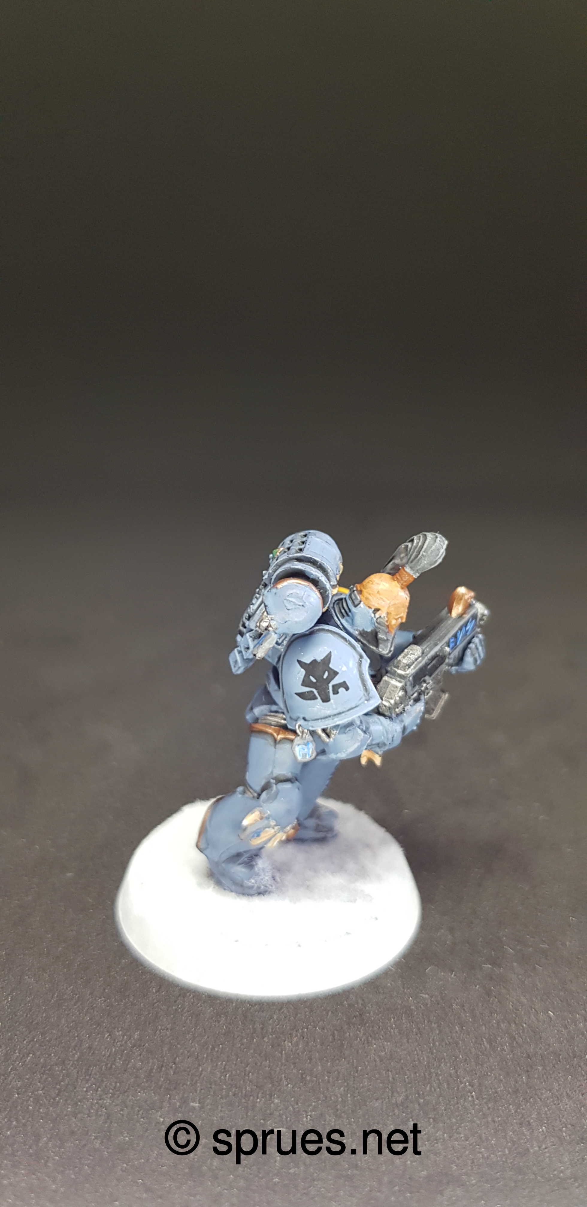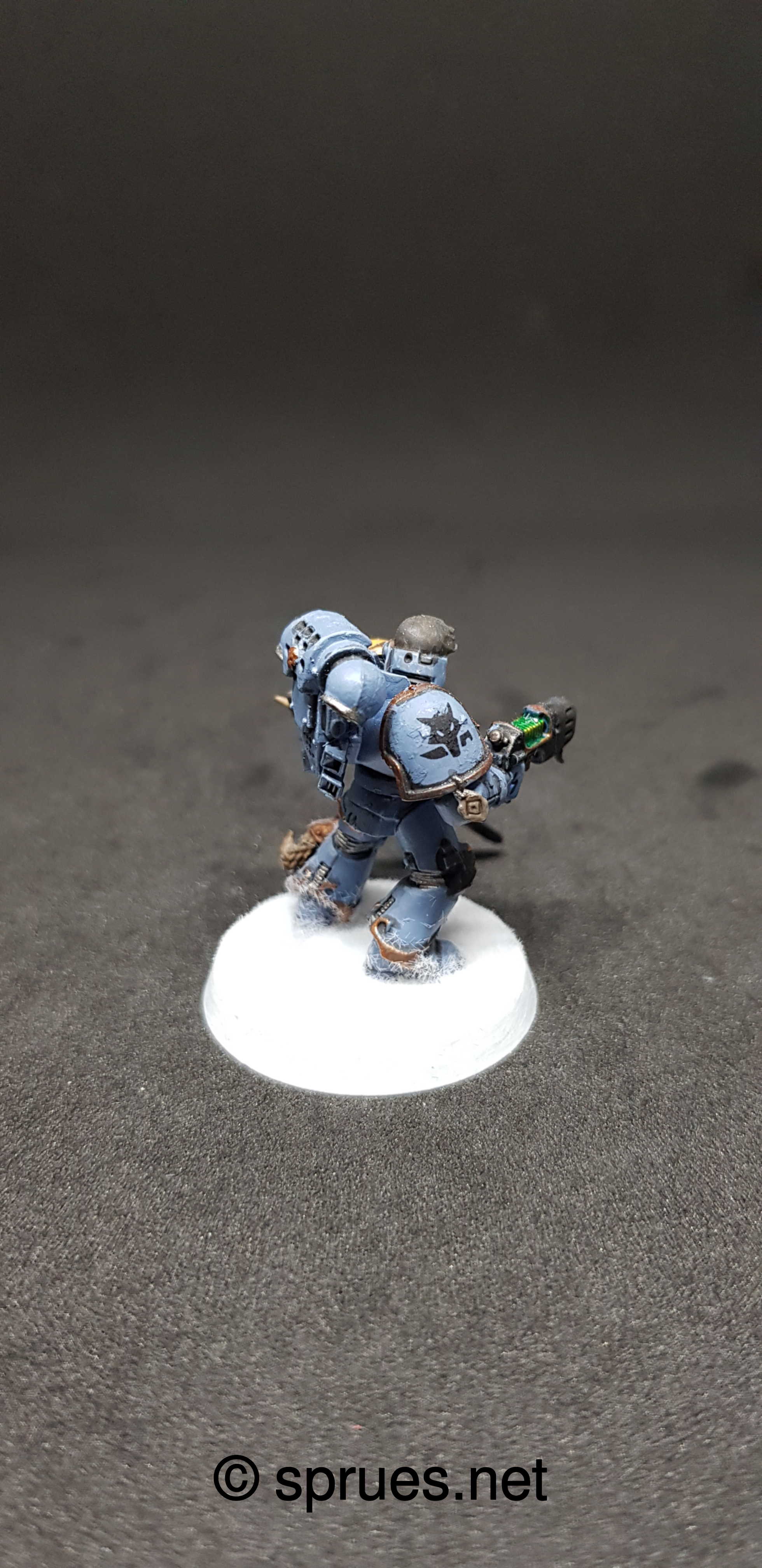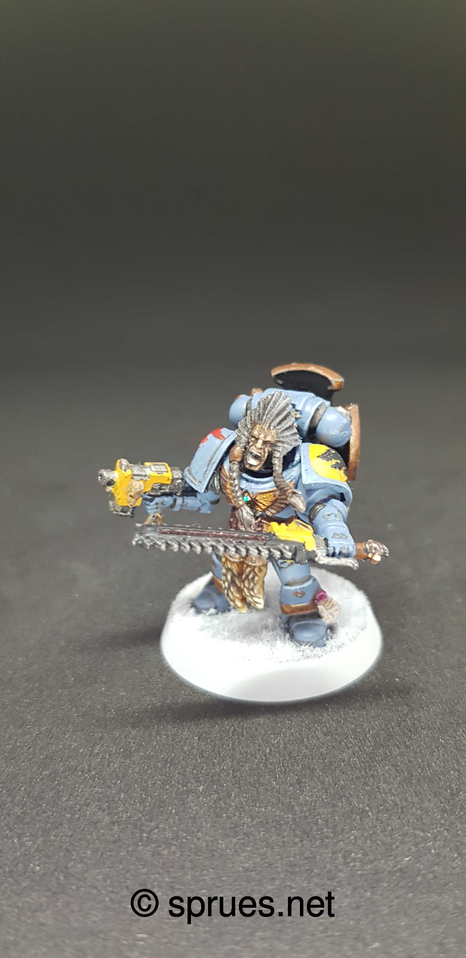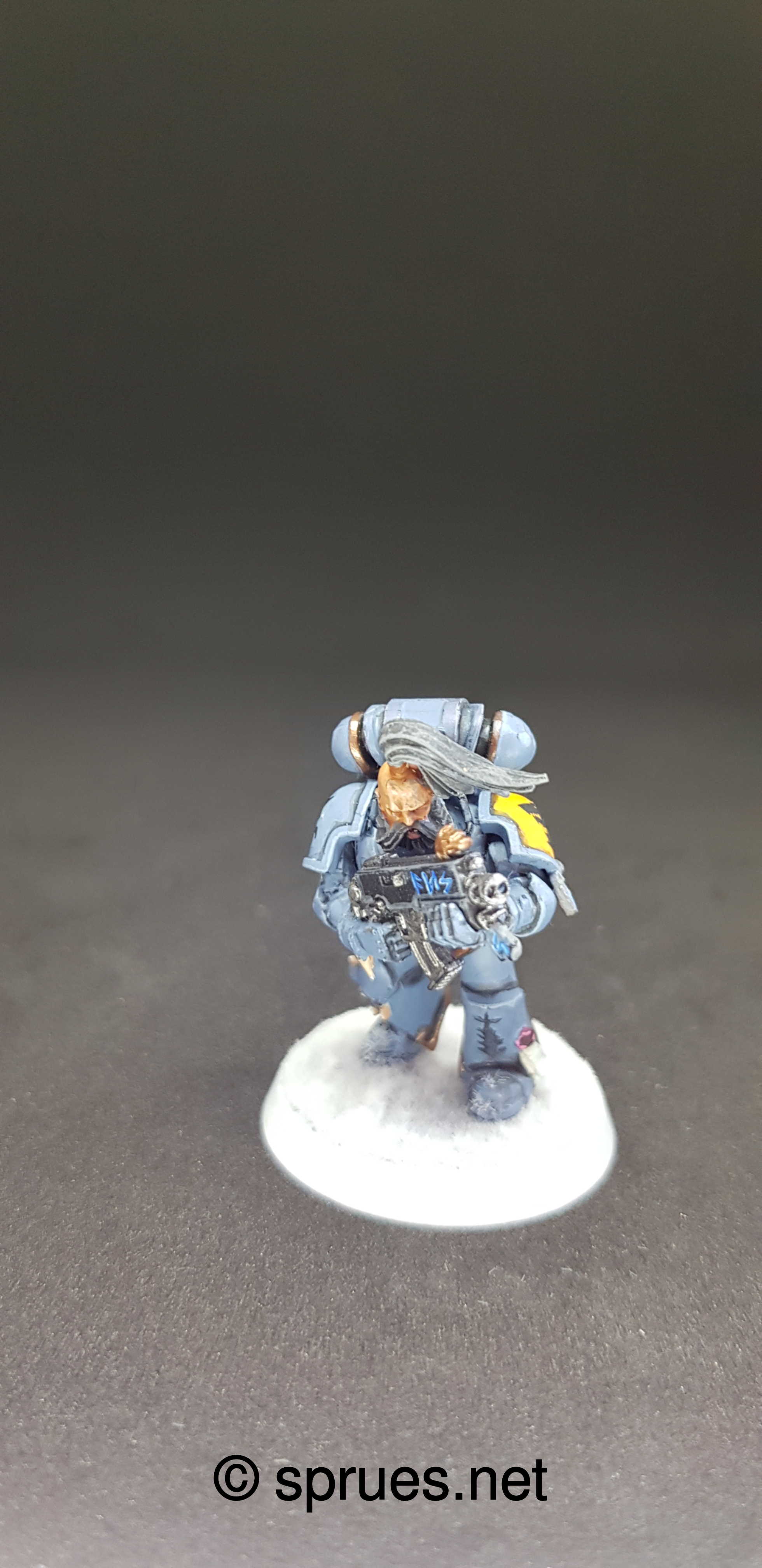 This Primaris was delivered as some kind of special model with some magazine. Mostly related to the fancy base, with all these stones, symbols and so on. Anyway this was perfect as some kind of Lone Wolf or Wolf Guard Battle Leader. His shoulder pad wears a similar pack sign like Raegrecs Blades, mostly to support them if necessary.