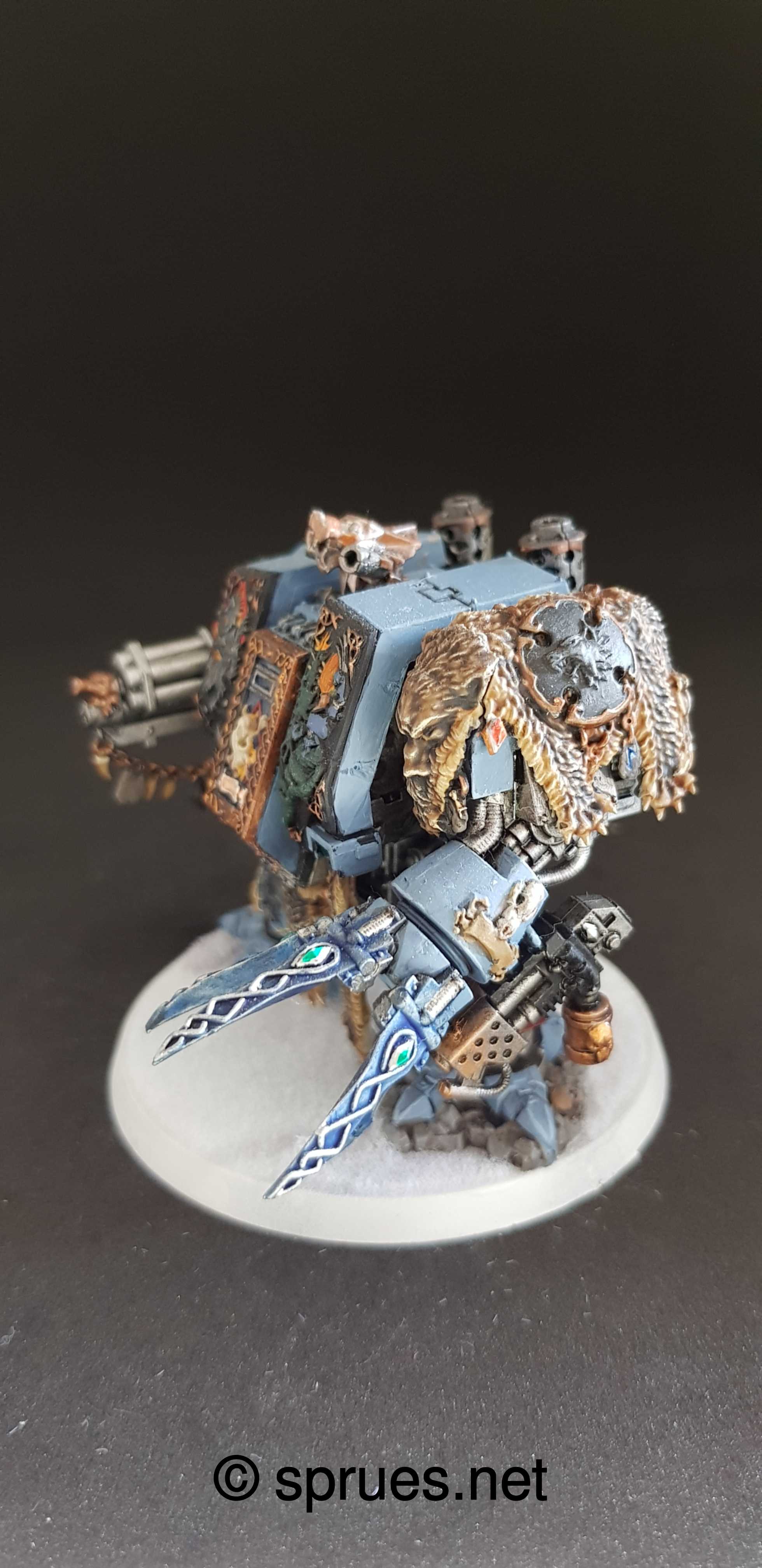 Bjorn the Fell-Handed was painted over two months. The color scheme and also his weapons were selected based on the Space Wolves Codex from 7. Edition. Sadly the sensor on his right arm was removed during the modeling process. However painting the wolf, dragon and Space Wolf, including all the Gold and Silver details was really funny. Up to this point I thought painting bigger models is easier, related to the fact that they tend to contain less small details. At least the Dreadnought from #DeathCompany was simpler to paint - not Bjorn.