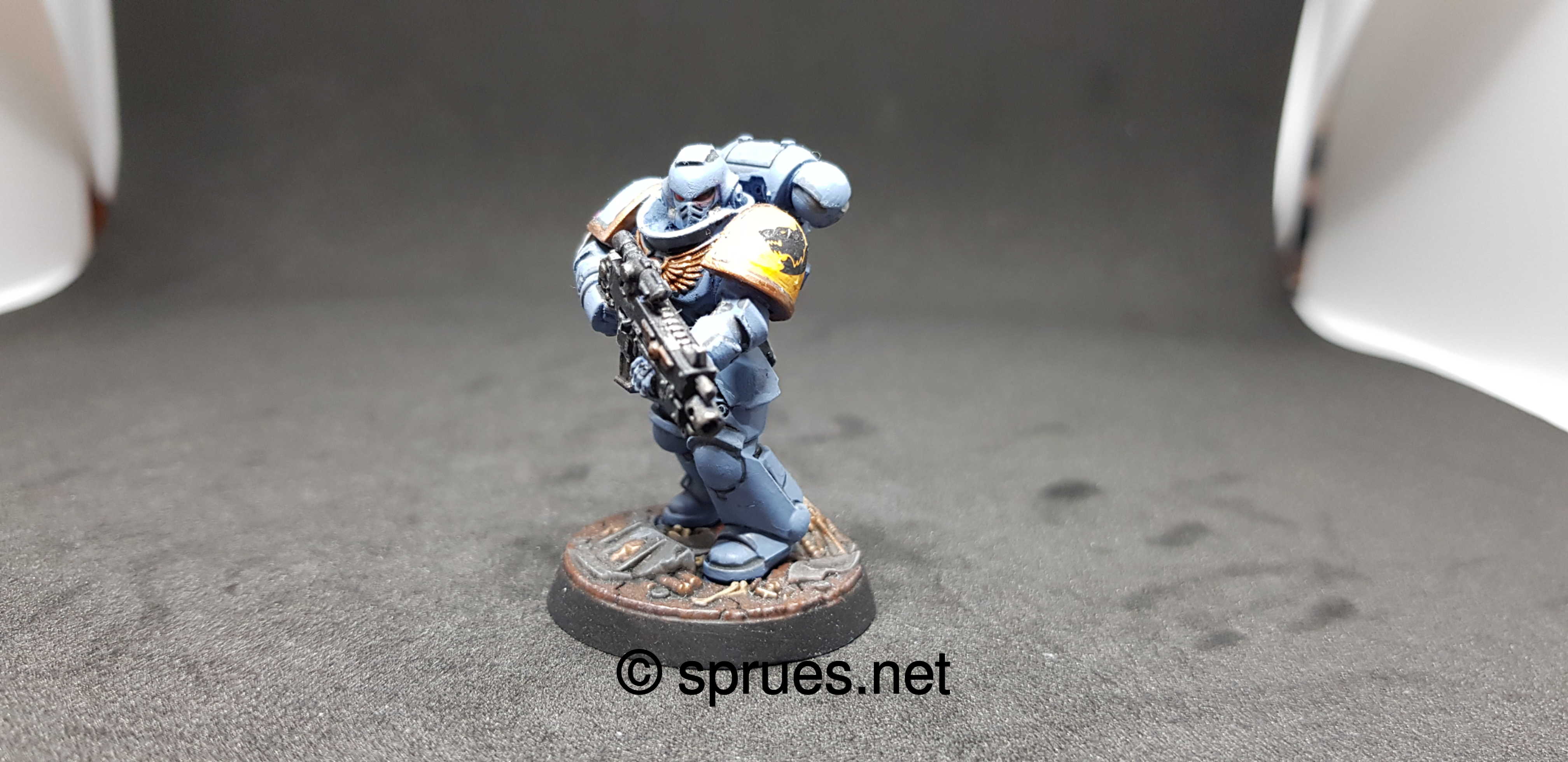 These model was taken out of an old convolute. As the model is quite old and also missing the backpack, myself decided to paint it as some kind of statue. So it can serve as accessory for Scenery. The shoulder pads display the signs for a tactical Imperial Fist.