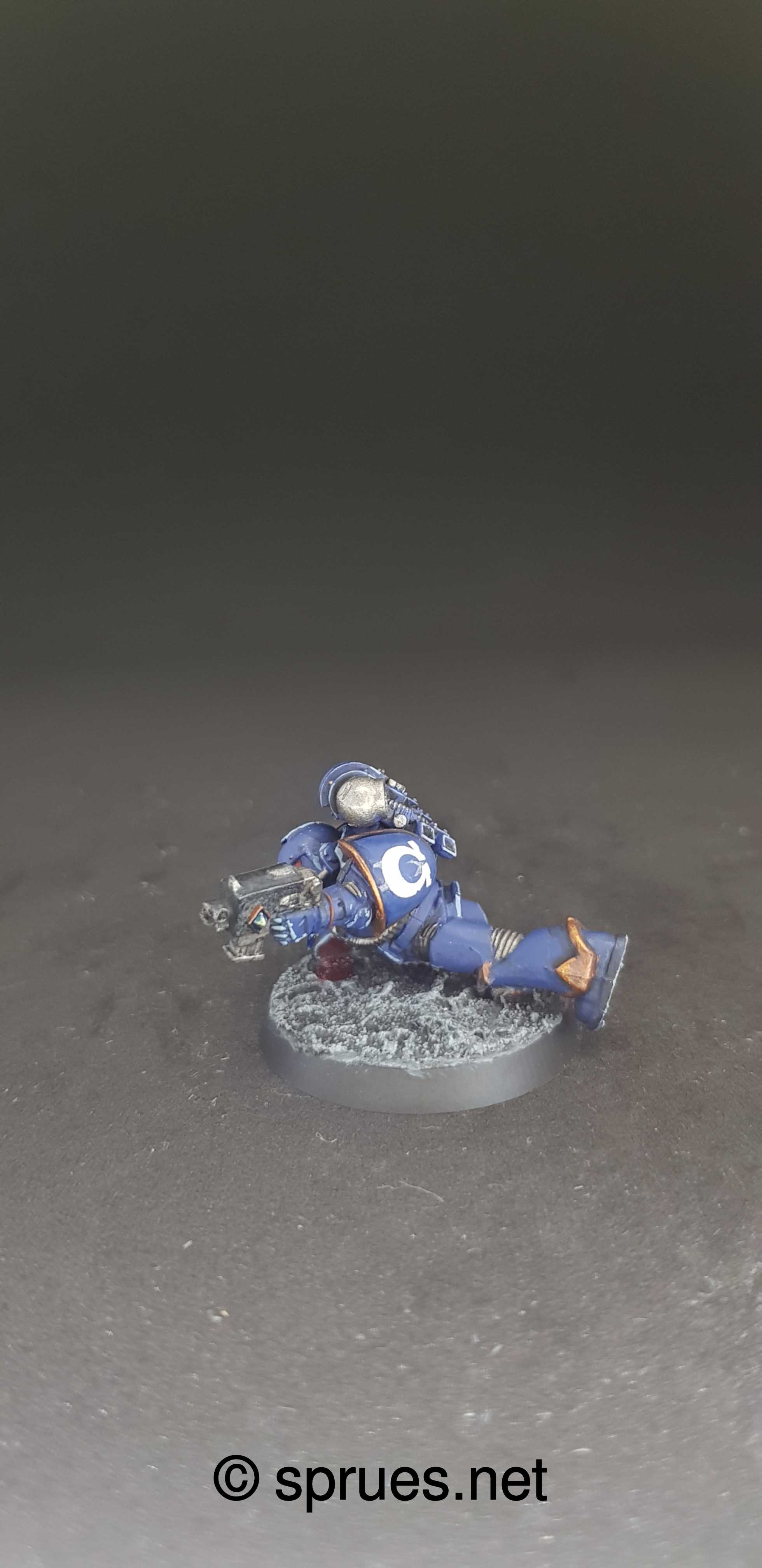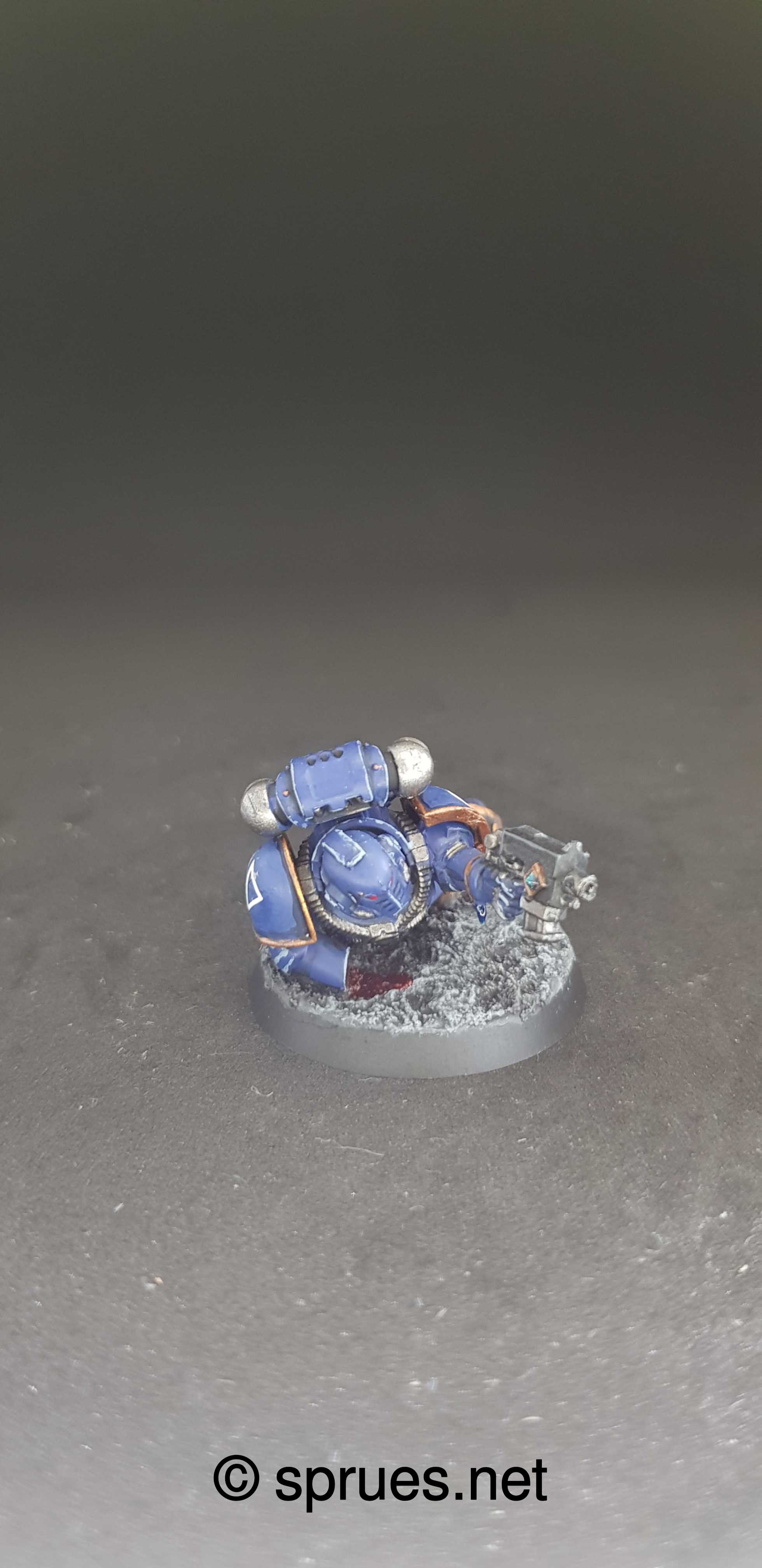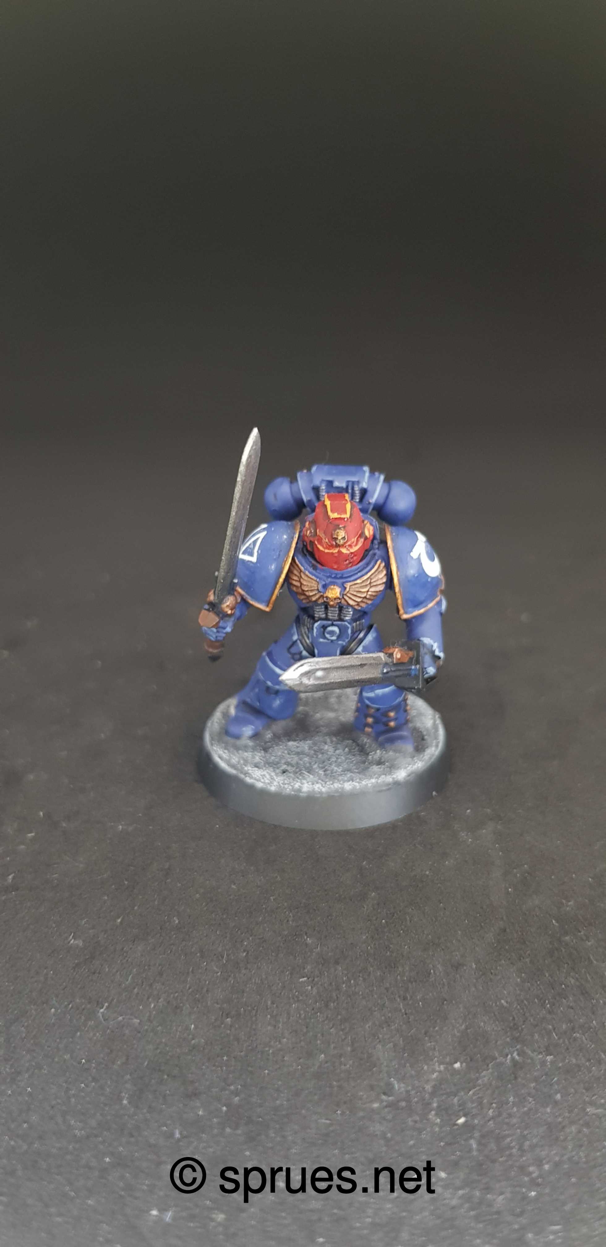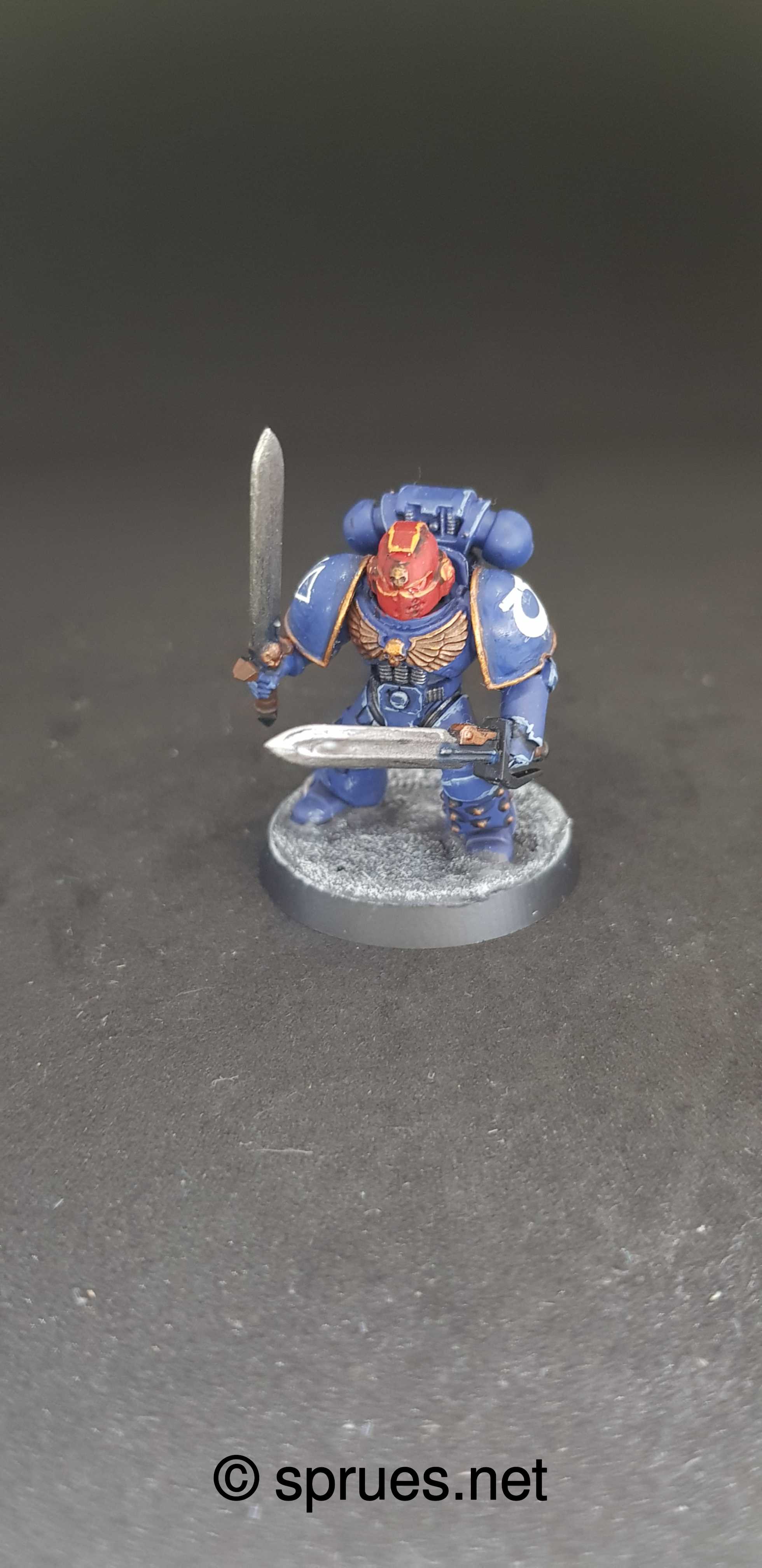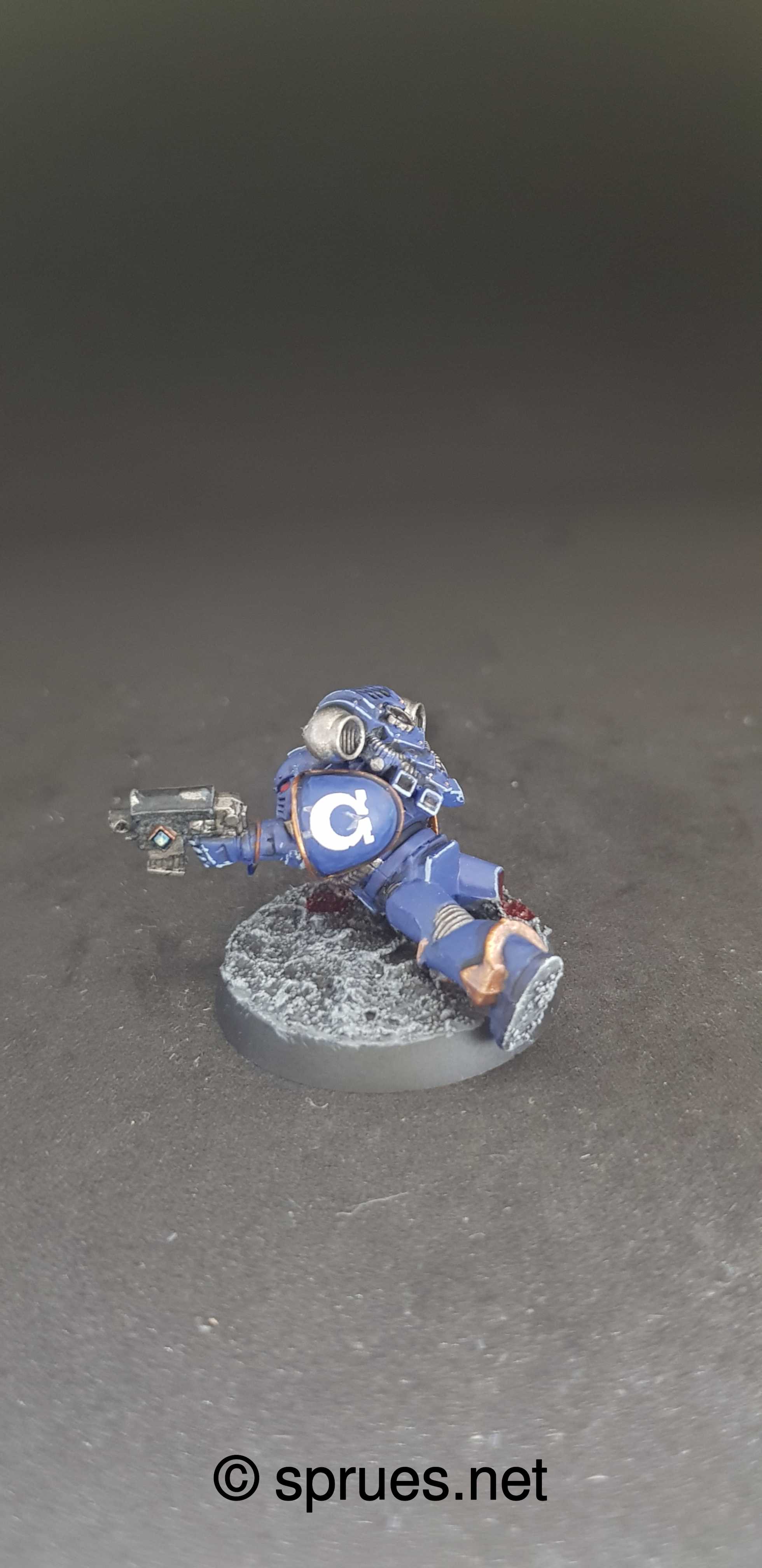 Captain Aethon's Legion Veteran Tatical Squad Ny were fuse together during the Betral at Calth. Take a look at the different models. Referring to the amazing healing ability from Ultramarines one of them is still fighting, even with only one hand and one leg remaining. Also you will notice the red helmet marine with two swords. During The Horus Heresy these red helmets were used to mark a marine for punishment. This red helmet marine represents Sergeant Aeonid Thiel, a famous warrior during the Horus Heresy. All bits for this model were chosen related to the cover art from Neil Roberts for the Short Story Censure.