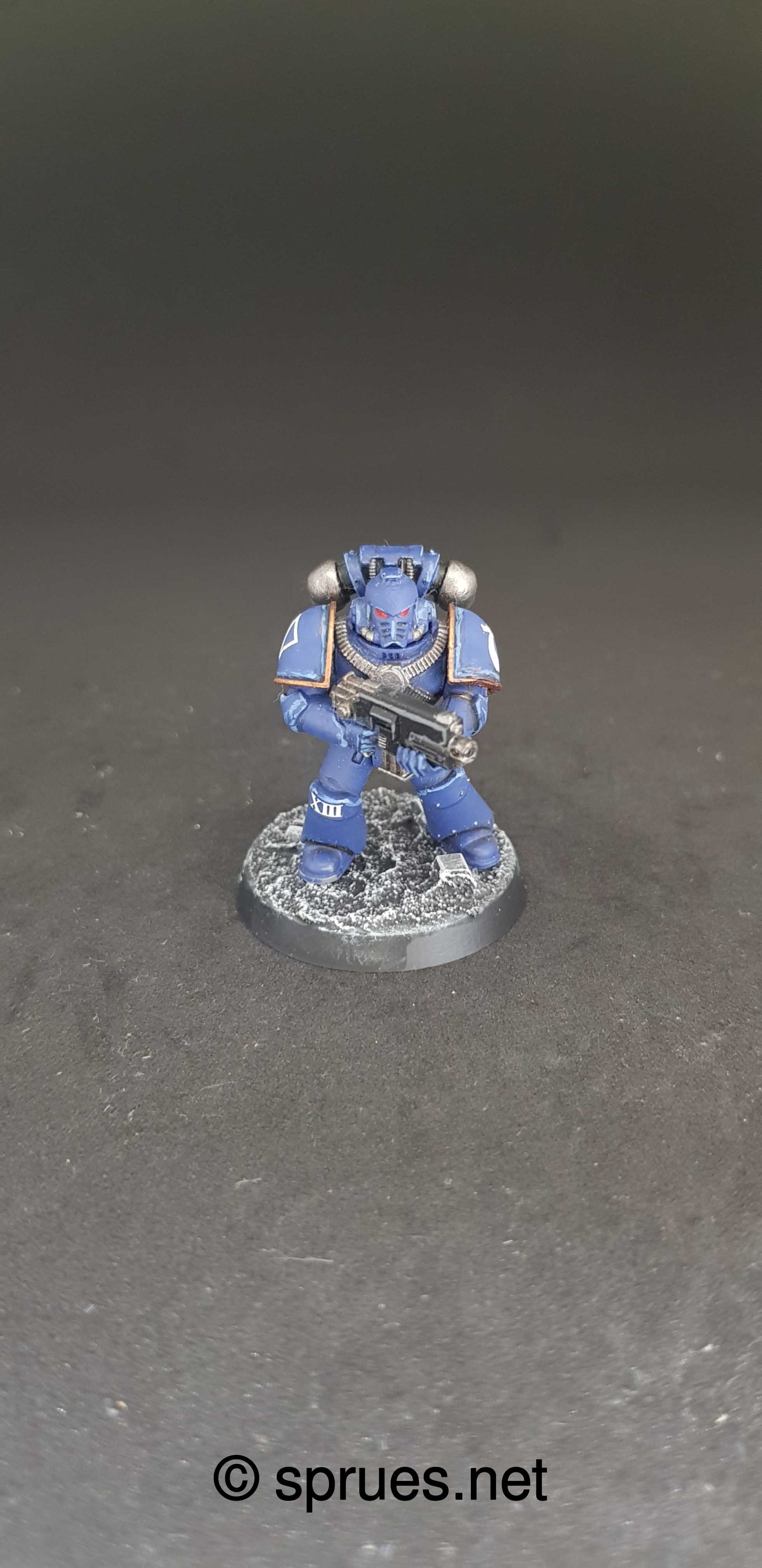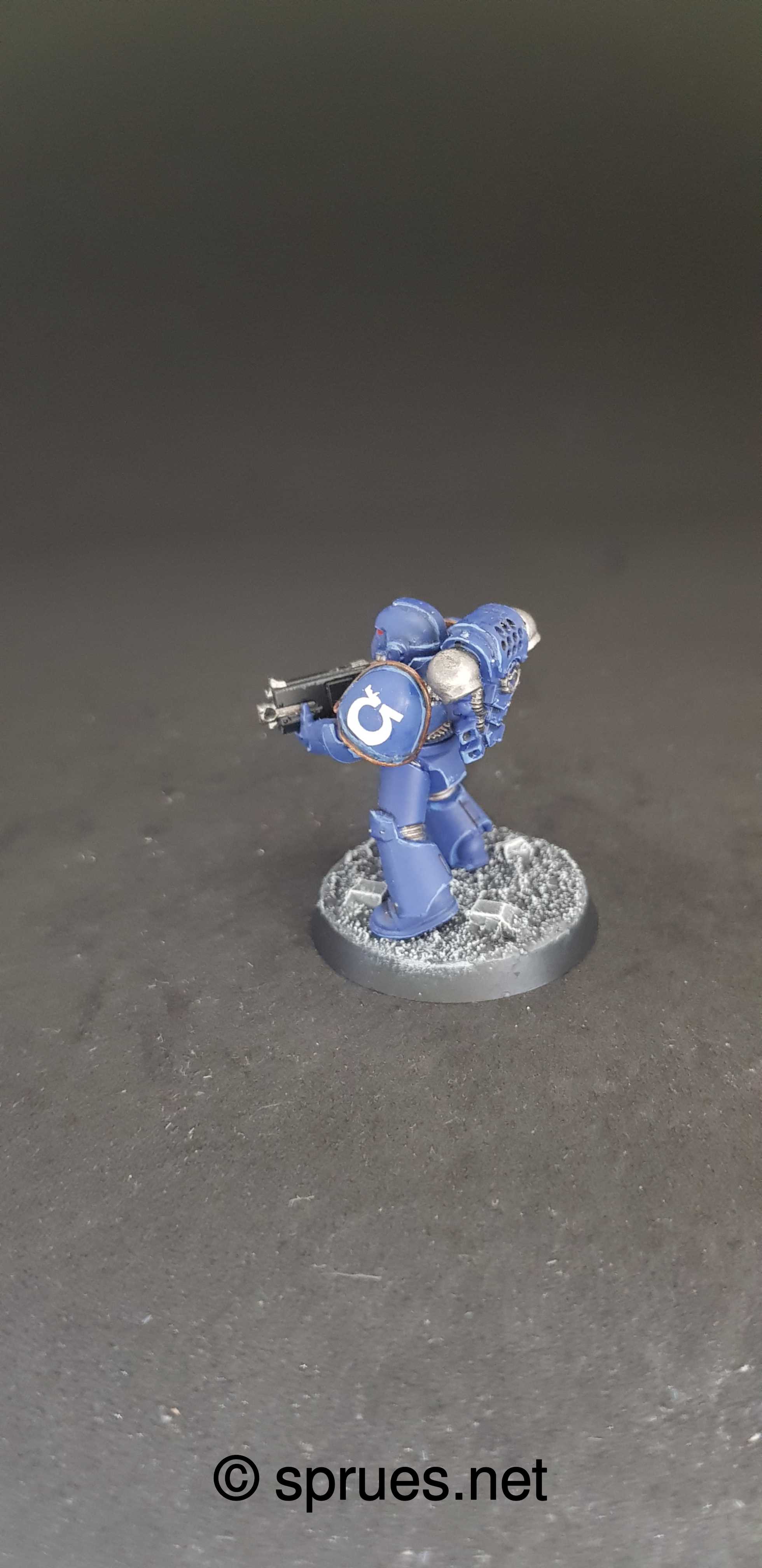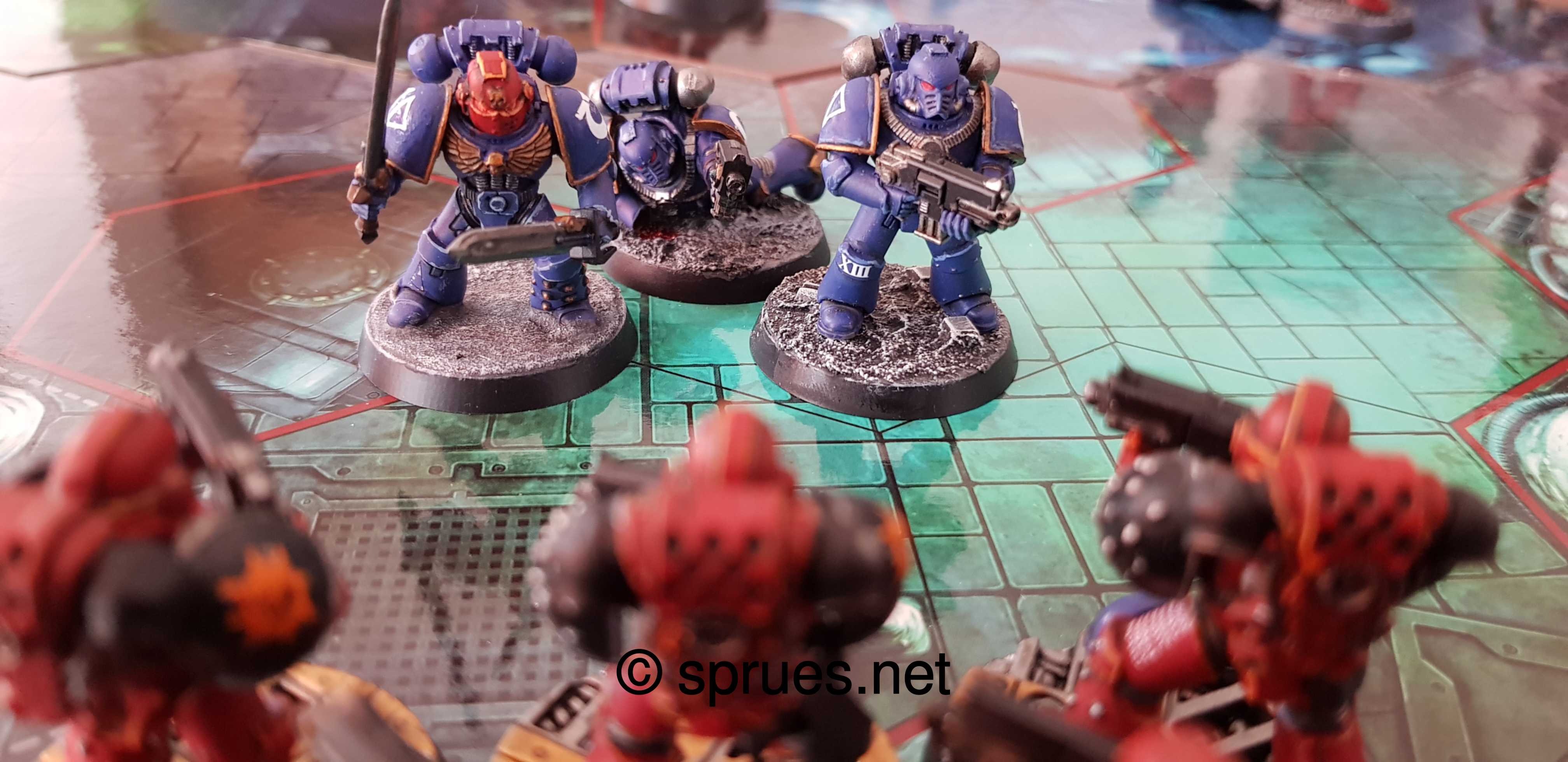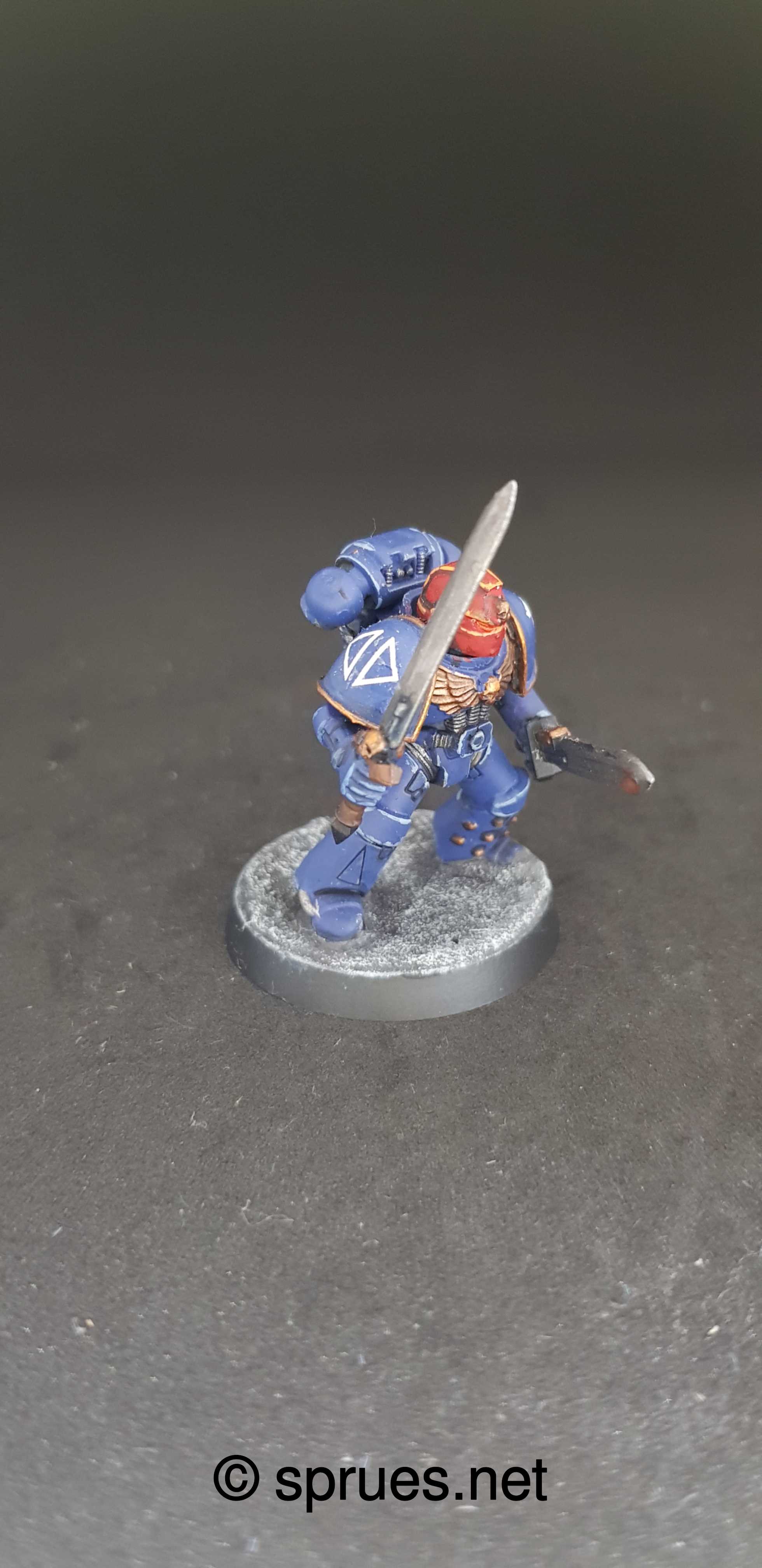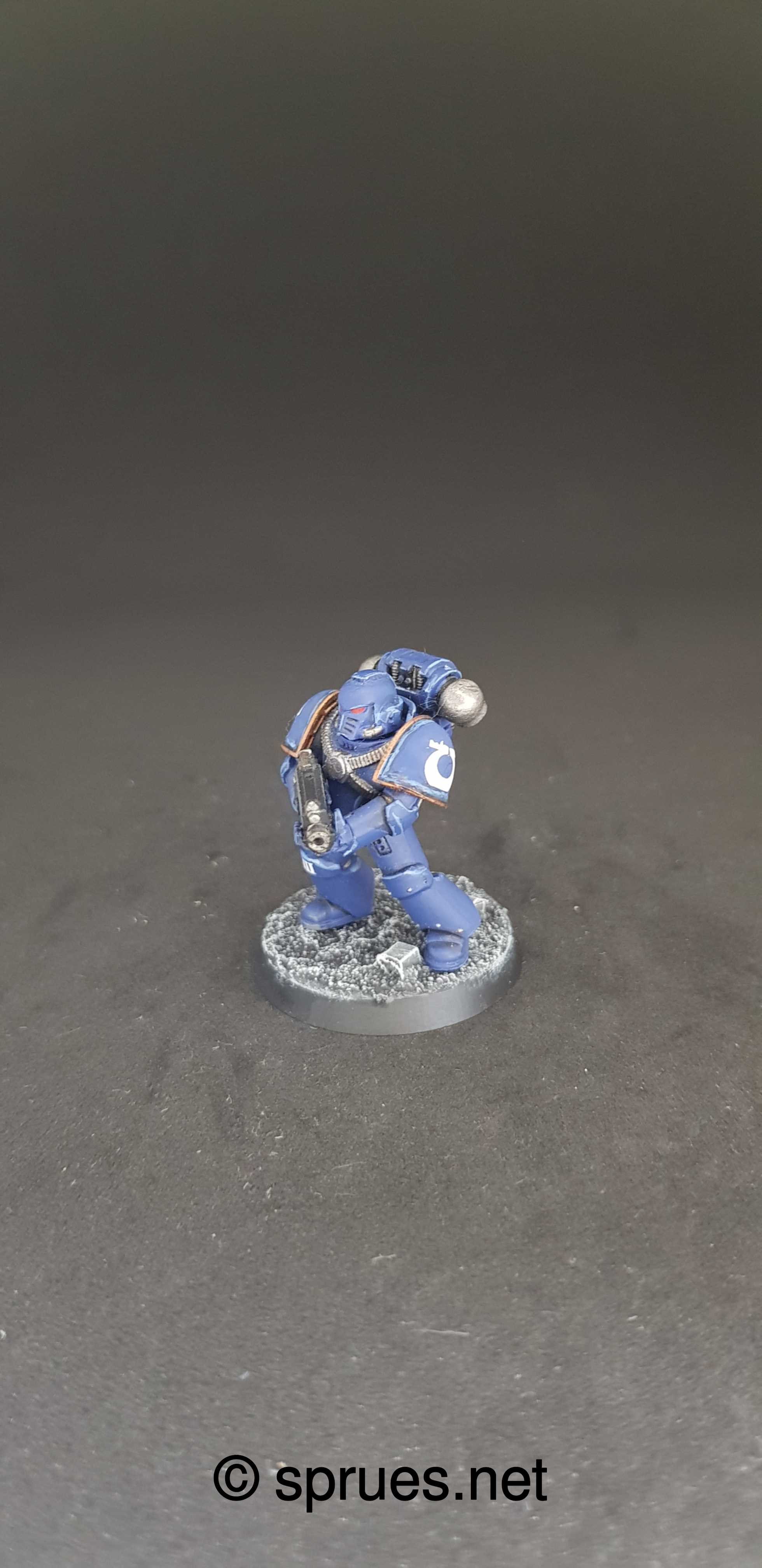 Captain Aethon's Legion Veteran Tatical Squad Ny were fuse together during the Betral at Calth. Take a look at the different models. Referring to the amazing healing ability from Ultramarines one of them is still fighting, even with only one hand and one leg remaining. Also you will notice the red helmet marine with two swords. During The Horus Heresy these red helmets were used to mark a marine for punishment. This red helmet marine represents Sergeant Aeonid Thiel, a famous warrior during the Horus Heresy. All bits for this model were chosen related to the cover art from Neil Roberts for the Short Story Censure.